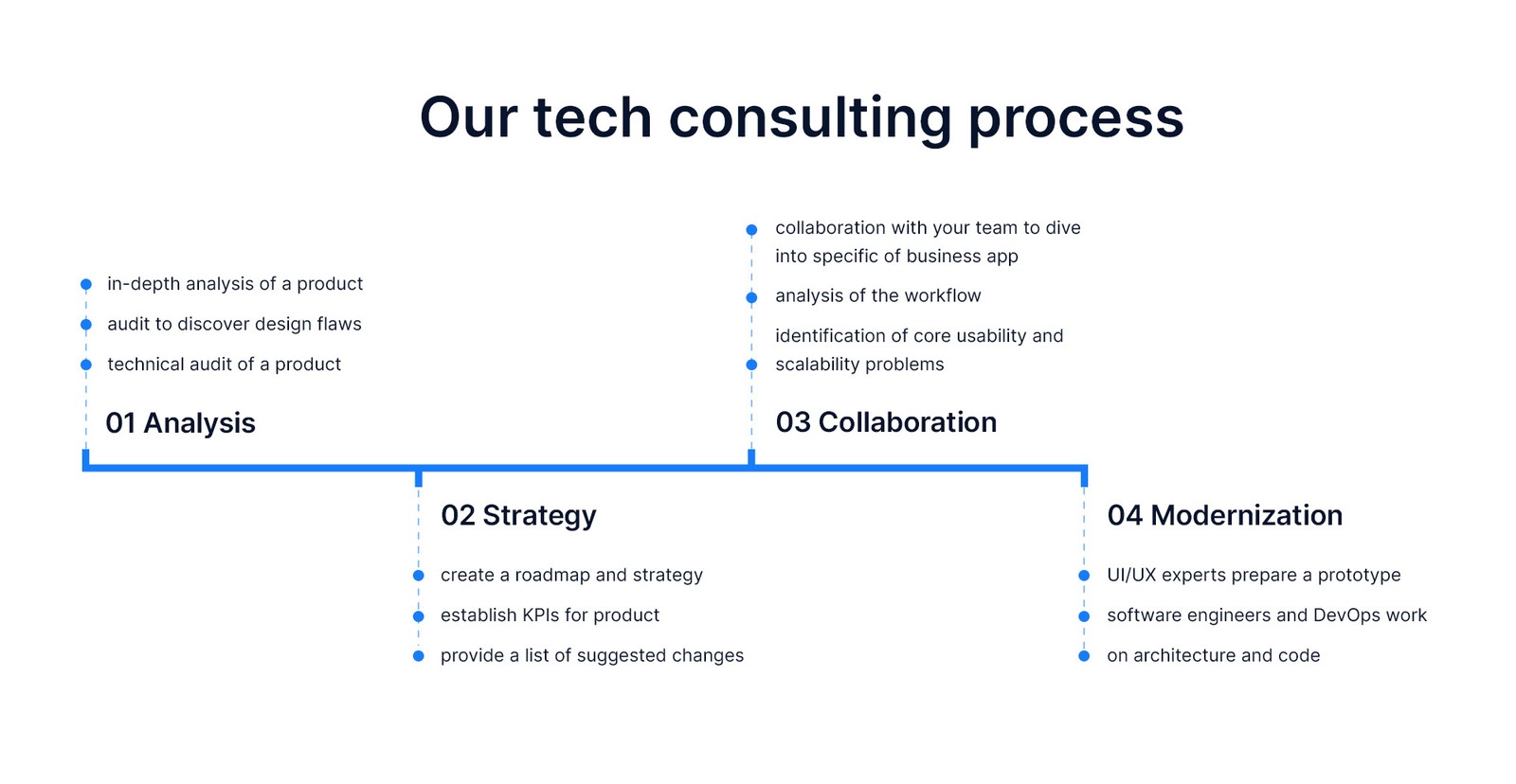 In today's business, IT technology consulting is becoming a necessity for companies that have their product but need to learn how to bring it to a new level of productivity. It is a valuable option for businesses from various industries looking to improve efficiency, adopt new technologies, and stay competitive. It brings many benefits and helps opt for the right modernization strategy, mitigate possible risks, collect data-driven insights, and prepare for the upcoming development phase.